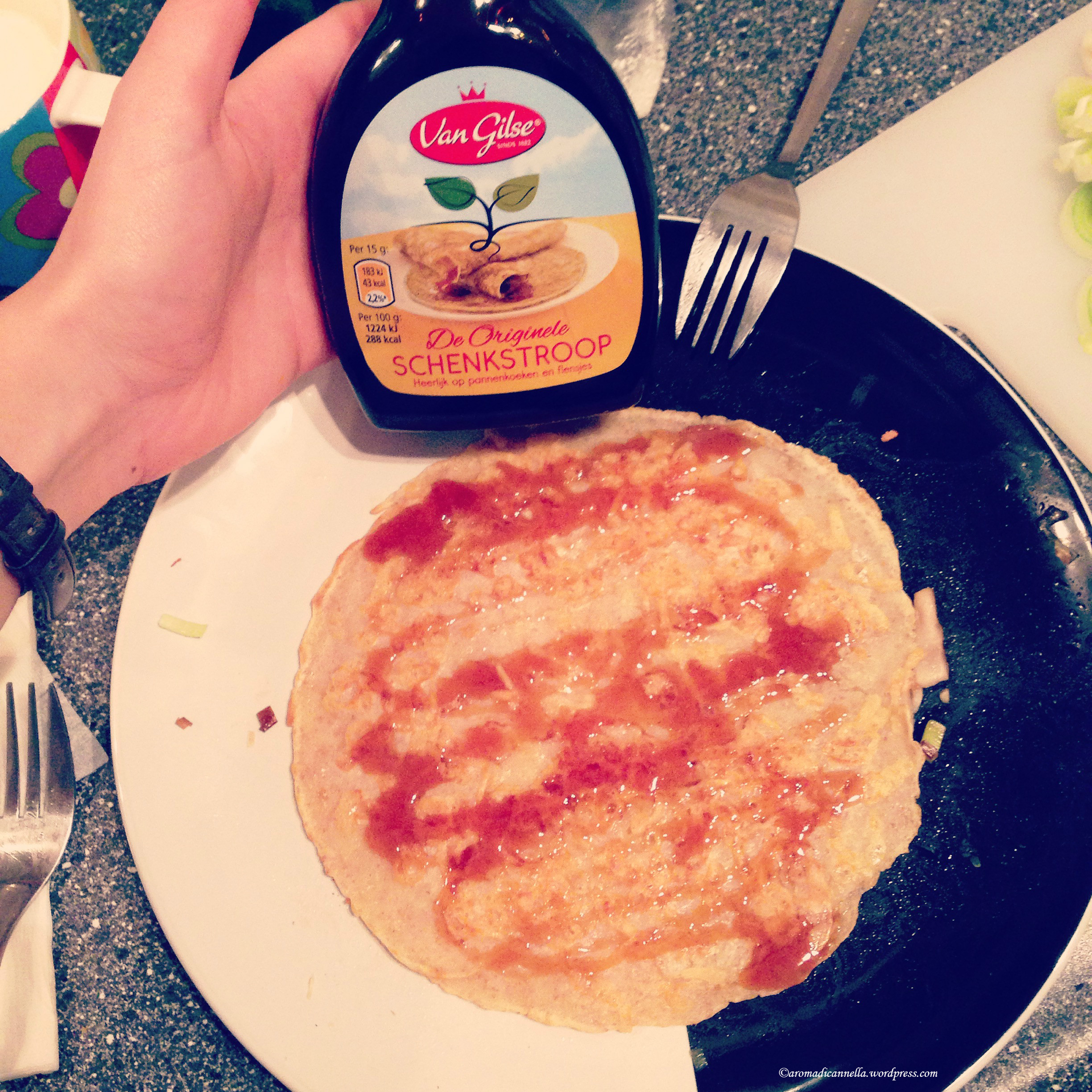 Ora, il tocco tipico olandese è di condire i pancakes con lo schenkstroop. Che dire, è tutta un’esperienza: unire questo sciroppo dolciastro a un suo che, ma devo abituarmici.