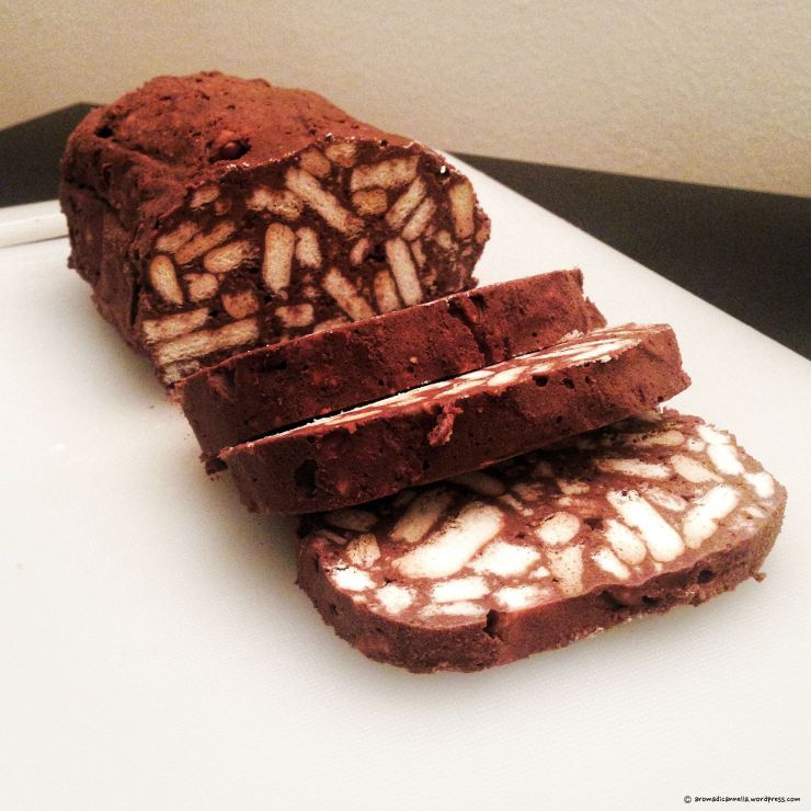 Prendete un foglio di carta forno e versate il composto, conferendogli la forma di salame arrotolandolo sulla carta forno. Avvolgetelo in un foglio di carta stagnola e ponetelo in frigo fino a che si sia indurito (almeno 3/4 ore, meglio ancora se lo preparate il giorno prima.