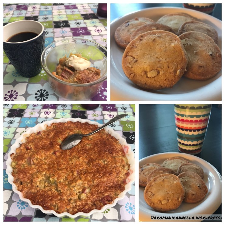 So, to honor my lovely (unfortunately-not-residence(yet)) country, today I share with you two new recipes that are perfect for a traditional Swedish fika. The Italian buddies can easily read back the post I wrote about fika during my Erasmus time in Sweden. For other readers, in super short, fika means having a coffee with pastries. During my holidays, I learnt something new, that is, people traditionally bake 7 different types of cookies to accompany fika. Unfortunately, E. and I didn’t have time to bake such a big variety of cookies (luckily, we were forced by the pouring rain to spend a day inside only once). However, we baked some delicious bondkakor (almond pastries) and a havregömda rabarber smulpaj (rhubarb crumble pie). Just amazing.