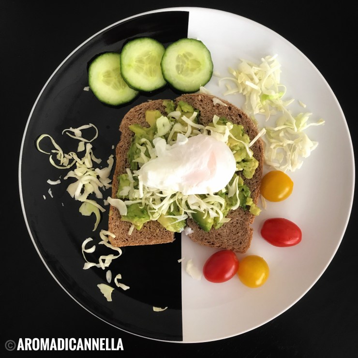 Ingredients for 1 serving: 70gr whole-wheat (homemade) bread, 1 egg, half avocado, 150gr cocktail tomatoes, 50gr cucumbers, salt & pepper.
