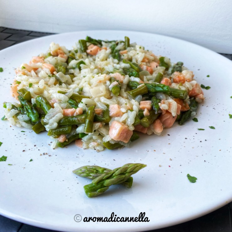 Now, it’s time to cook the rice with the vegetable stock (made of 1 water + 1 cube of vegetable bouillon). Add 1 cup of stock at time and stir gently while the risotto absorbs the stock. Keep adding the vegetable stock and stiring, while cooking the risotto (about 15-20 minutes). When it’s about 5/7 minutes left, add the asperges heads and 200gr of diced salmon; season with black pepper and parsley to taste. Last, add some parmesan cheese and stir with a wooden spoon until creamy.
