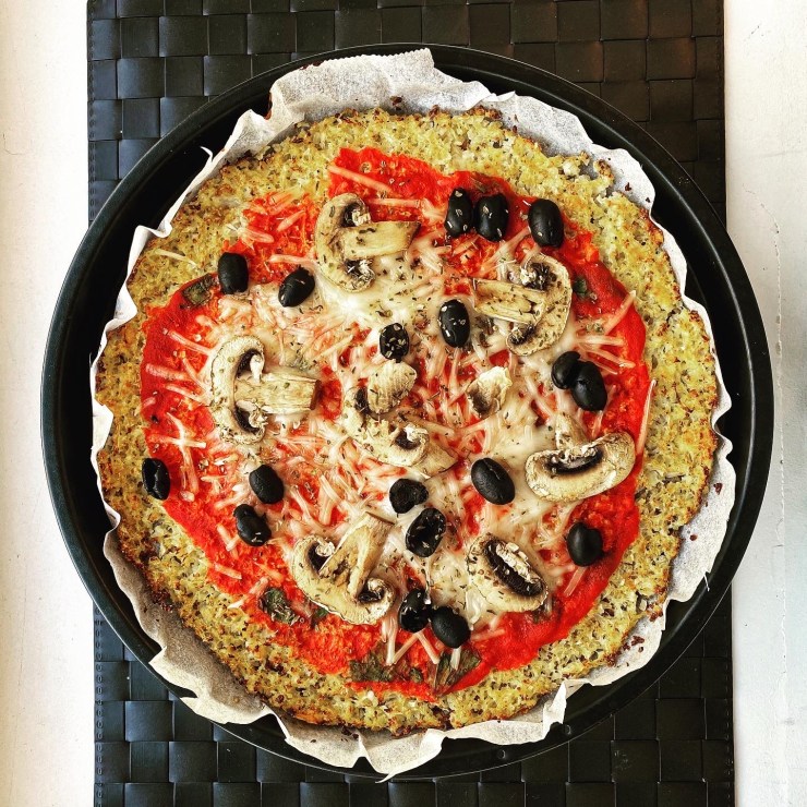 Steam one cauliflower, chop it until it’s like rice texture. Add 2 eggs, 8 tbs of flour and a grain of salt. Mix well, then spread it with a spatula on a baking tray covered by baking paper and make a round shape, like a pizza. Bake it in pre-heated oven 220° for about 20 minutes. Then, add tomato sauce, mozzarella and your favorite toppings! Here I used champignons, olives and oregano.