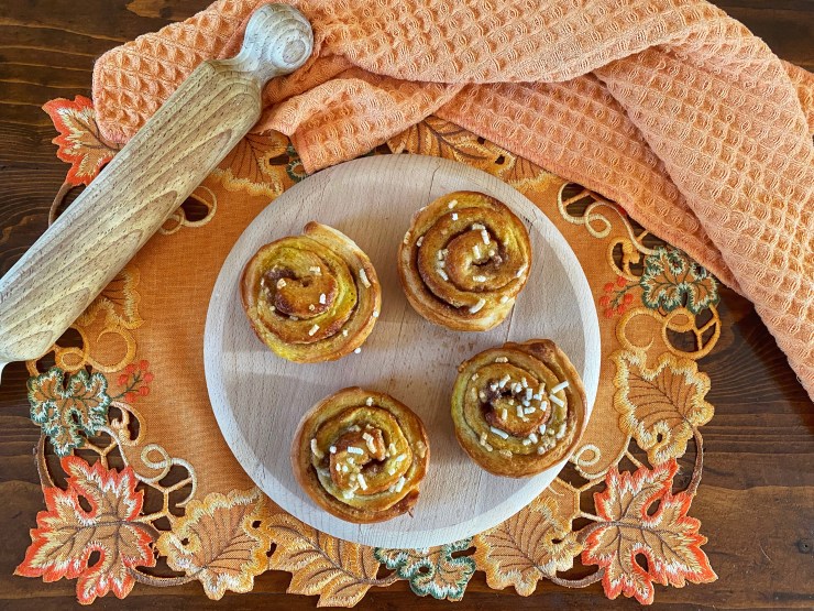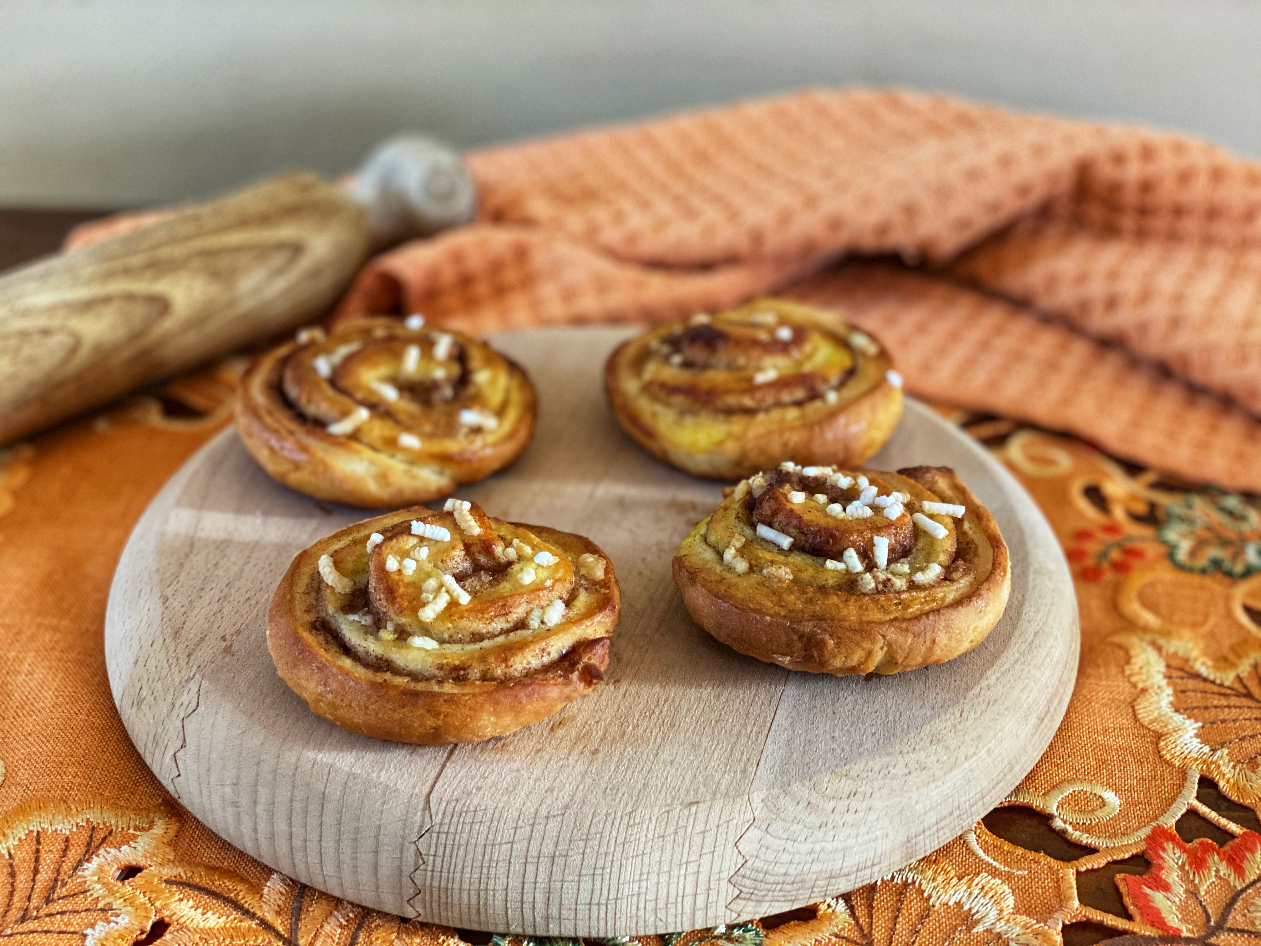 Divide the dough in 2 parts and roll them out so to give them a rectangular shape (about is 3 mm thick). For the filling, spread the room-temperature butter, sugar and cinnamon on top of the dough. Roll the dough and cut the roll into slices of about 1 cm. Place them in paper molds on a baking sheet and let rise under the kitchen towel for about 45-60 minutes until the buns are double-sized.