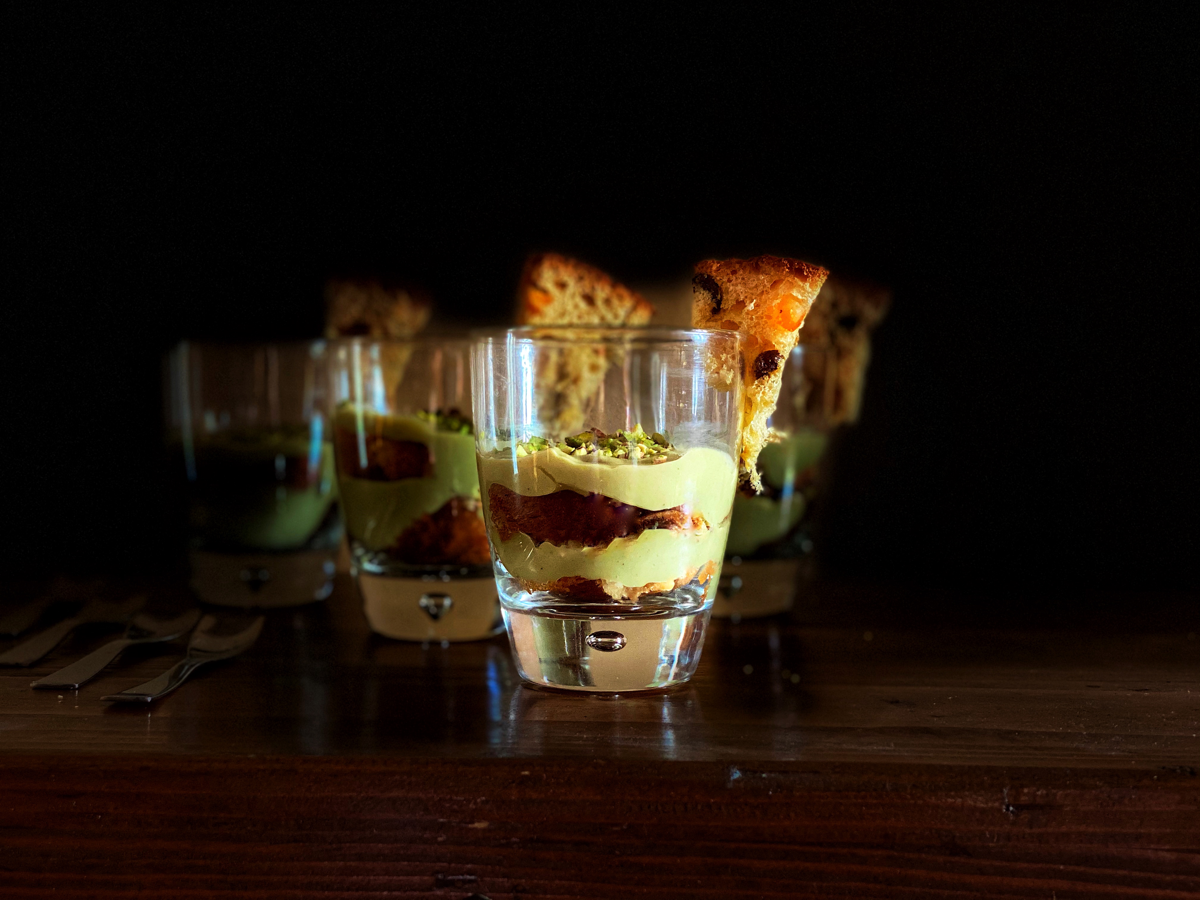 Now it’s assembling time! Take the drinking glasses and start with a layer of panettone pieces. Here, you have the option to brush the panettone layer with some flavored sugar syrup for cakes or some coffee so to wet the panettone before adding the cream. Next, add 2 tbsp cream, some hazelnuts, another layer of panettone, optional syrup/coffee, 2 tbsp cream and finish with pistachios.