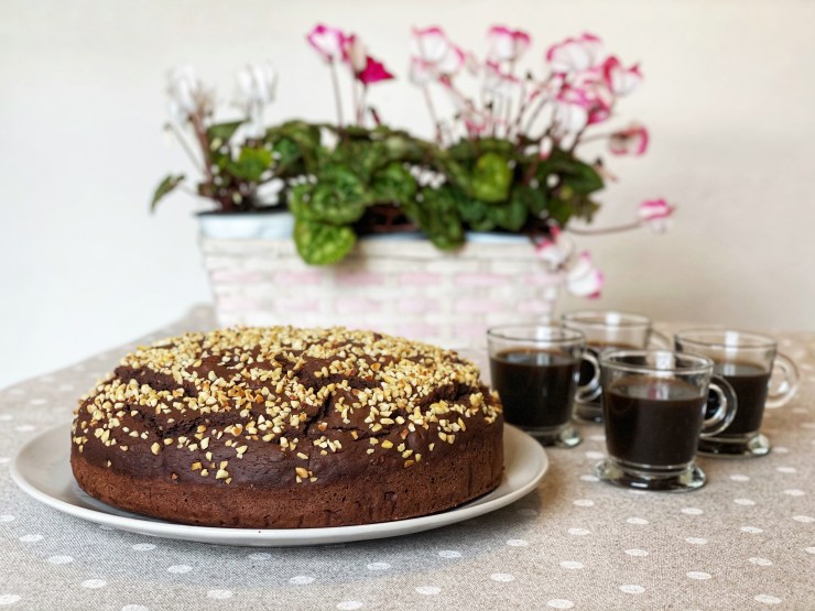 •Pour the batter on the cake tin (which you have previously covered with baking paper). Sprinkle the remaining hazelnuts on top.