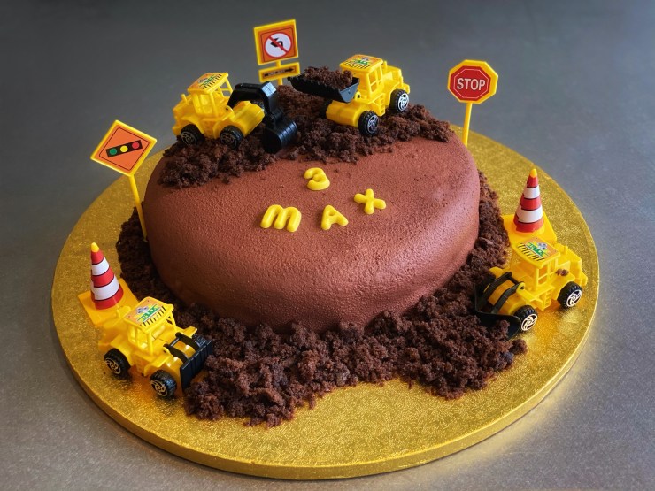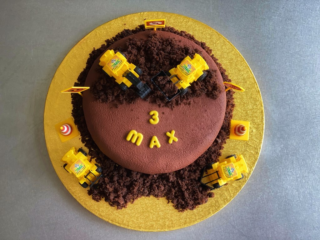 Roll out the marzipan (2-3 cm thick), cover the cake with it and gently press it on the cake so it sticks well. Cut any extra marzipan at the bottom of the cake. Next, spray evenly the cake with the food color to make if brown. Then, you can use chocolate muffin crumbles to simulate the mud of a construction site and place some on the top and on the sides of the cake as you like. Last, finish your decorations with any chocolate letters (we used them to write ‘ 3 Max’) and have fun with the excavator toys.