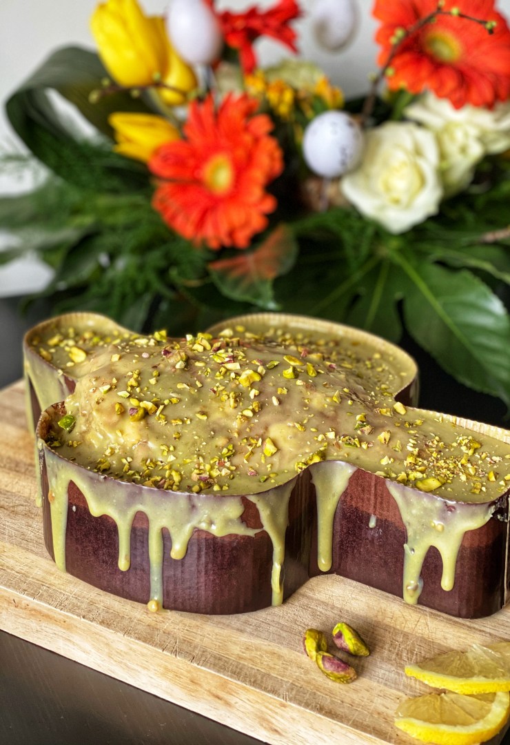 Italian traditional Easter Colomba cake with pistachios and lemon