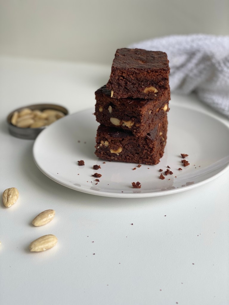 Pour the brownies batter in a squared baking tin covered with greaseproof paper. Bake in preheated (static) over for 20-25 minutes. The top should be firm and the inside soft. Let the brownies cool down before cutting them into squares.