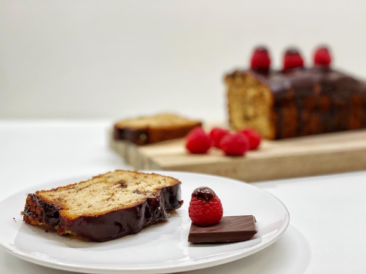 For the chocolate glaze, chop the dark chocolate. Then, heat the water the sugar until it boils; add the chocolate and cook at low-heat until it melts. Let the glaze cool down for about 10 minutes. Pour the chocolate on the cake and let it cool down completed before serving.