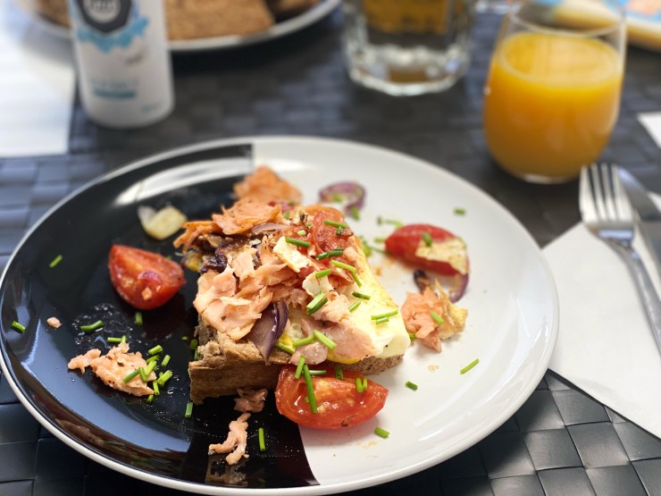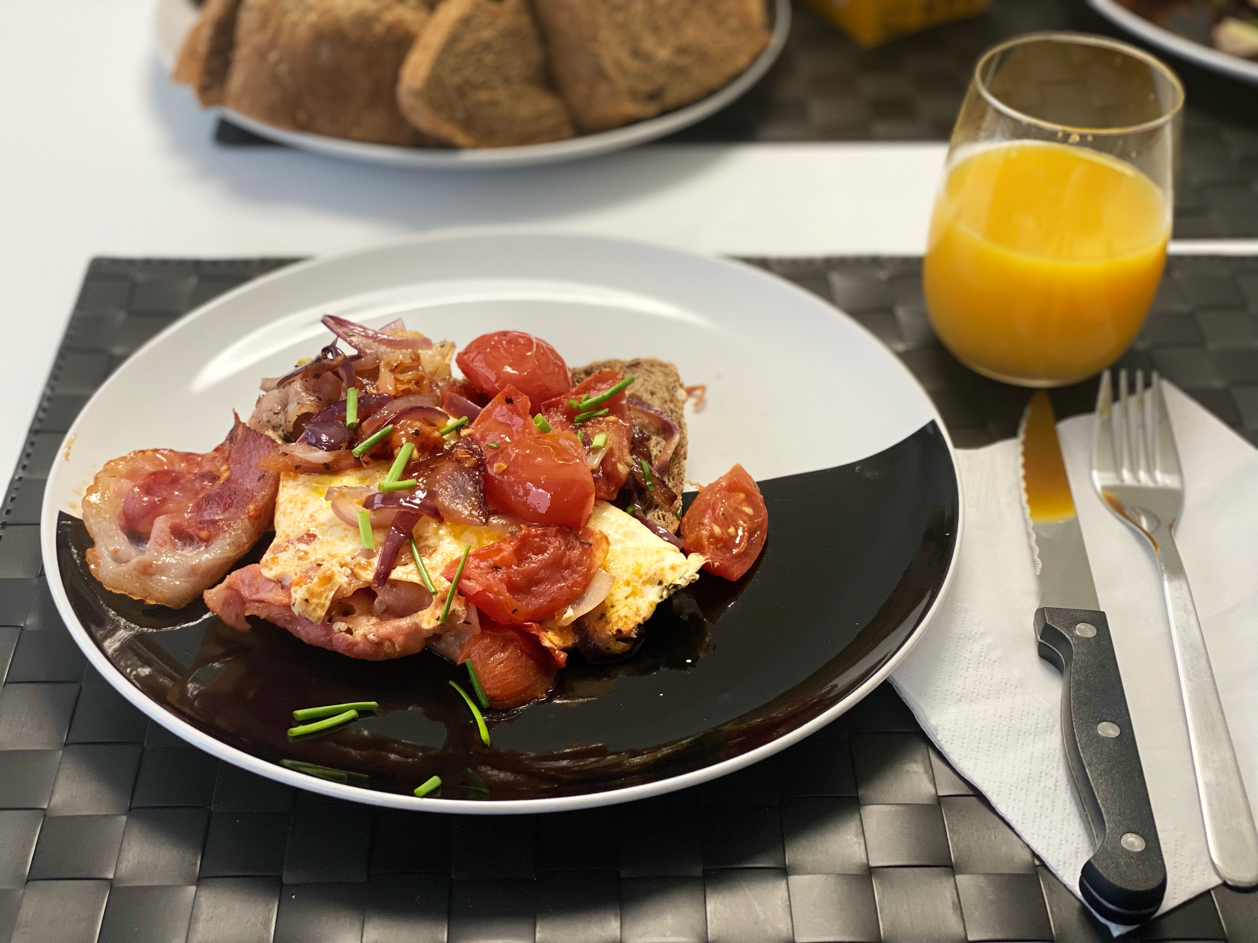 Start with chopping the onion and cutting the tomatoes in quarters. Then, in a pan add a bit of olive oil and bake the onion first, until golden. Then, move the onions in one corner (1/3) of the pan, add the tomatoes with a pinch of salt in another 1/3 of the pan, and the bacon or salmon in the remaining 1/3 of the pan. Bake at medium heat until the tomatoes start to soften and the salmon/bacon becomes crispy.