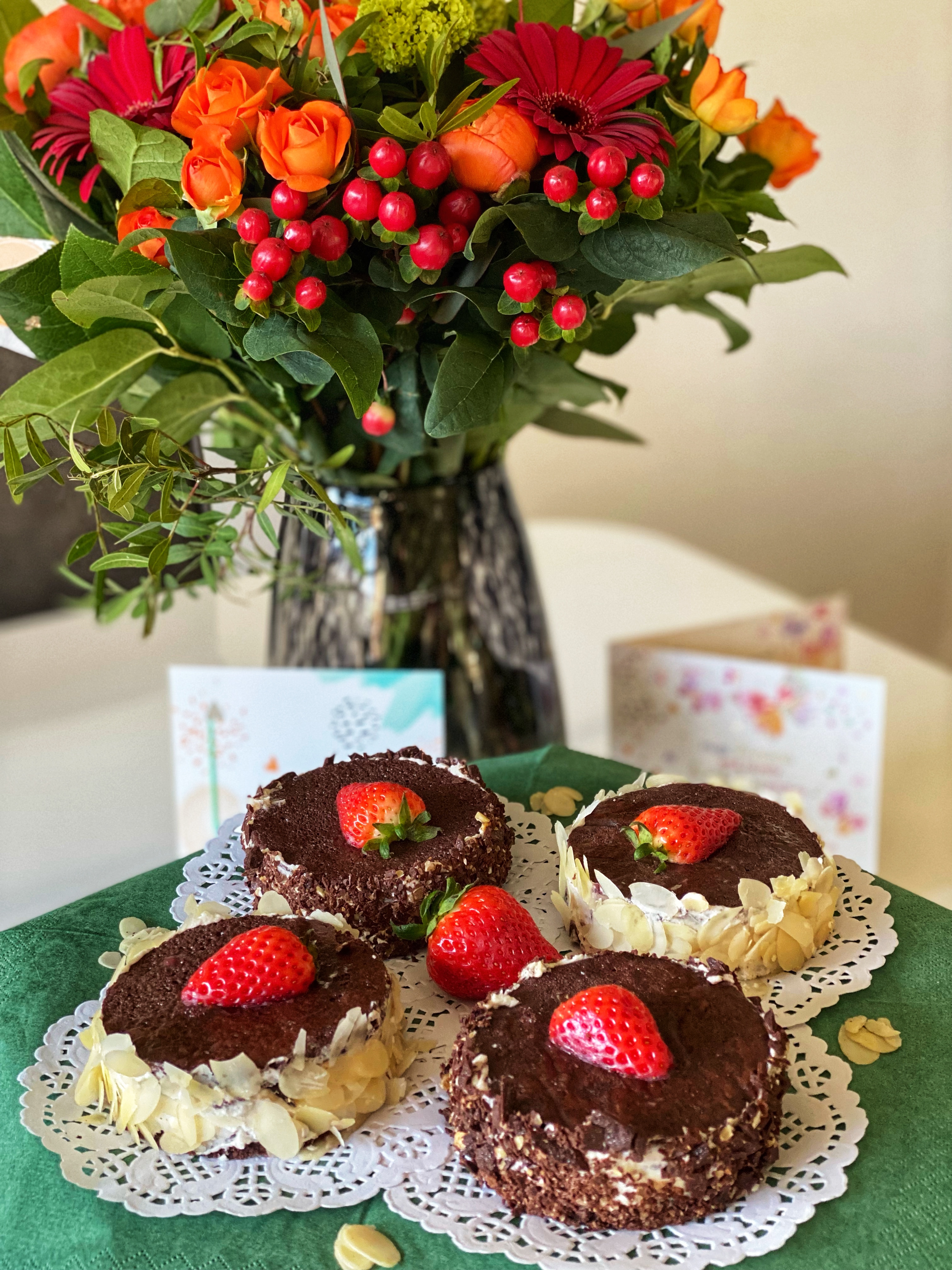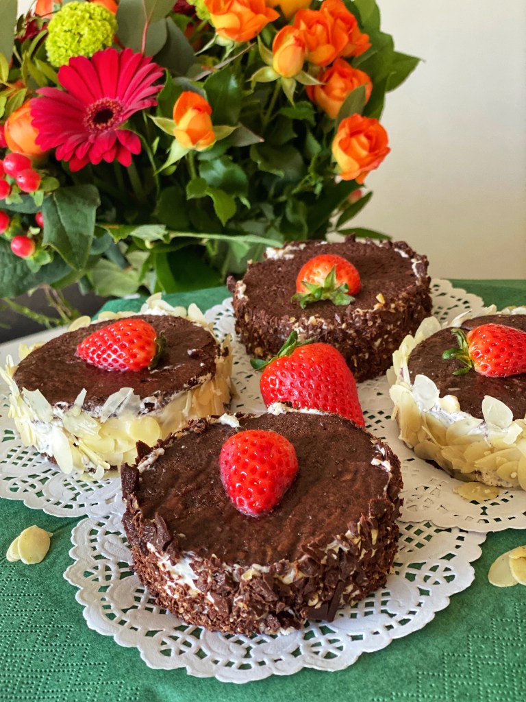 Of course, I couldn’t be without lots of love and wishes from my family back home, as well as lots of friends and people I know from far and nearby. And, as tradition wants, I tried to live up (apparently with success, if we listen to the taster) to the traditional bday baking and had a little fun in the kitchen while baking some chocolate mini-cakes (using a base a chocolate marquise) filled with mascarpone-coconut cream and strawberries.