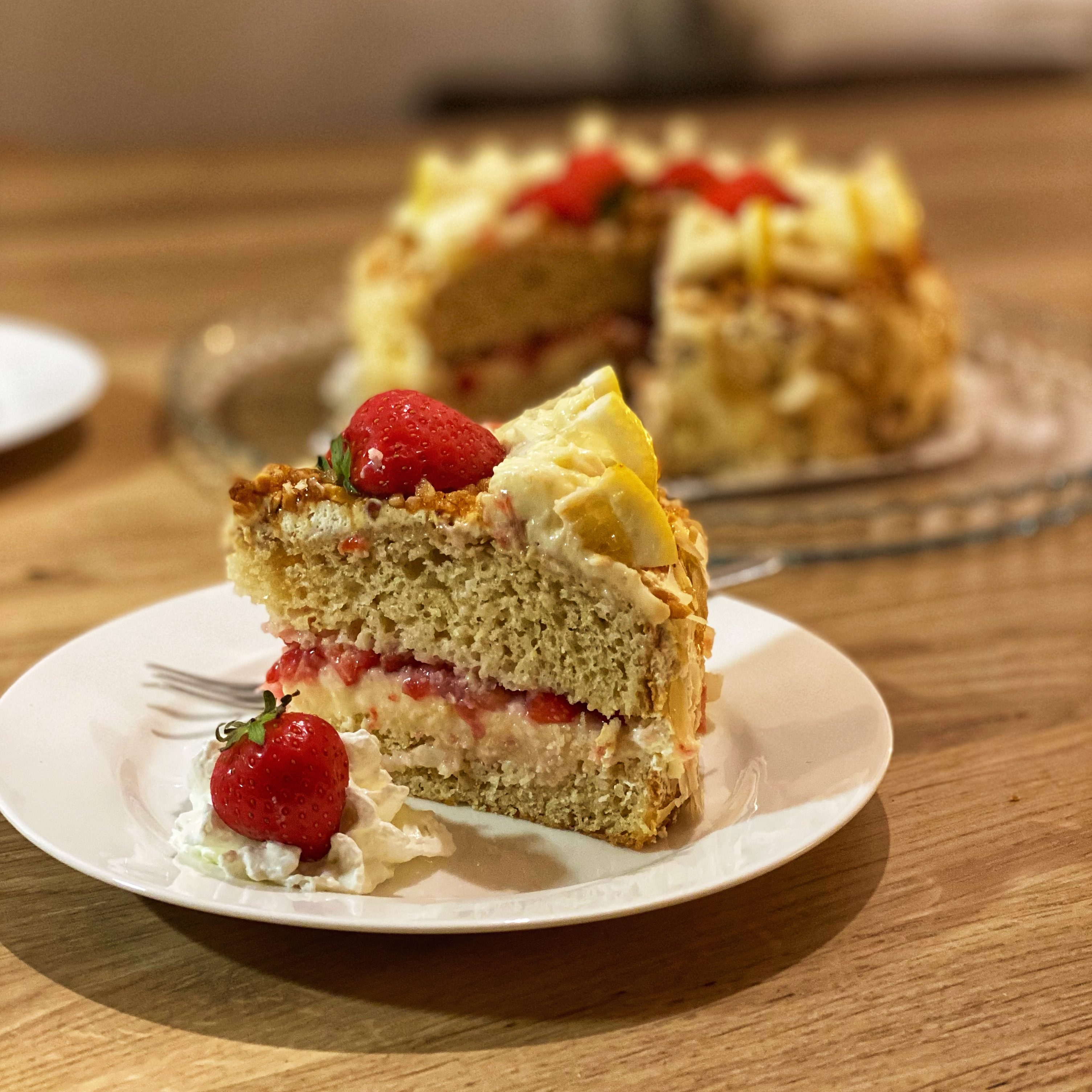 For assembling the cake, start with cutting the cake horizontally in two parts. Brush the lower cake layer with the lemon syrup liquid. Then, spread the 2/3 of lemon cream on top and remember to keep 1/3 for the decoration (see below). Add the diced strawberries (keep 3 nice strawberries for the final decoration). Add the top part of the cake, brush it with the syrup and cover the whole cake with a thin layer of whipped cream. Store the cake in the fridge for the night.