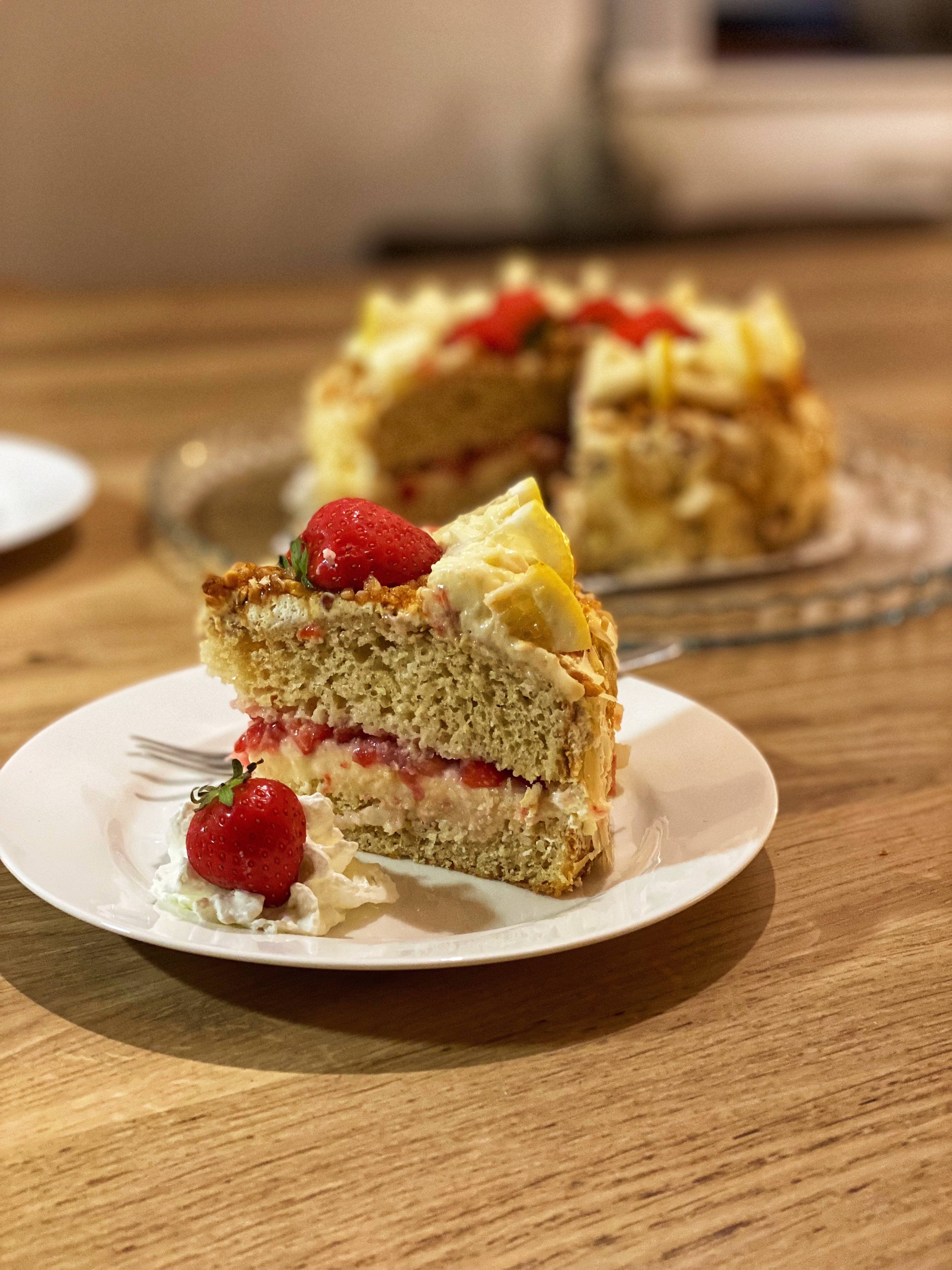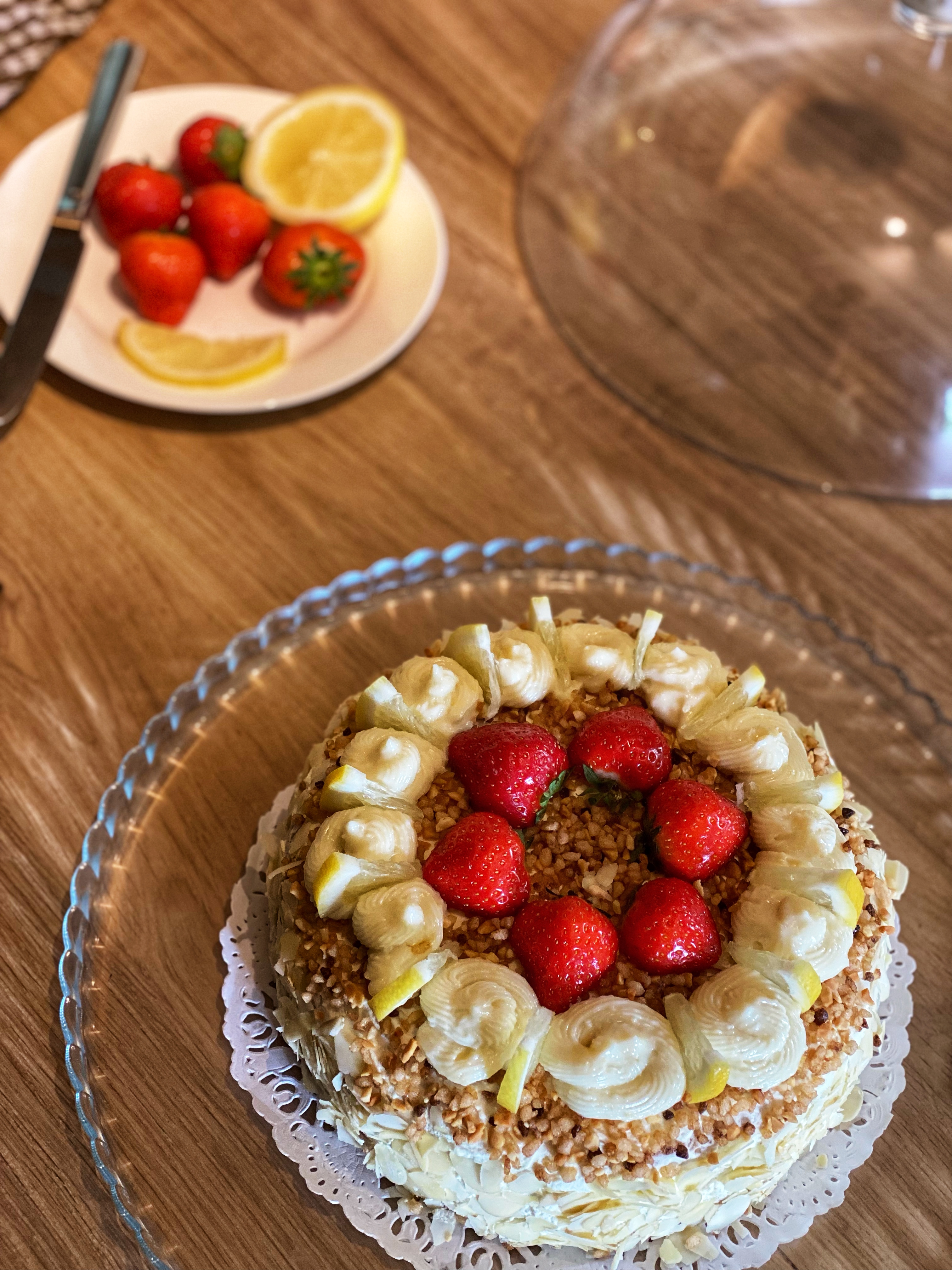 For assembling the cake, start with cutting the cake horizontally in two parts. Brush the lower cake layer with the lemon syrup liquid. Then, spread the 2/3 of lemon cream on top and remember to keep 1/3 for the decoration (see below). Add the diced strawberries (keep 3 nice strawberries for the final decoration). Add the top part of the cake, brush it with the syrup and cover the whole cake with a thin layer of whipped cream. Store the cake in the fridge for the night.