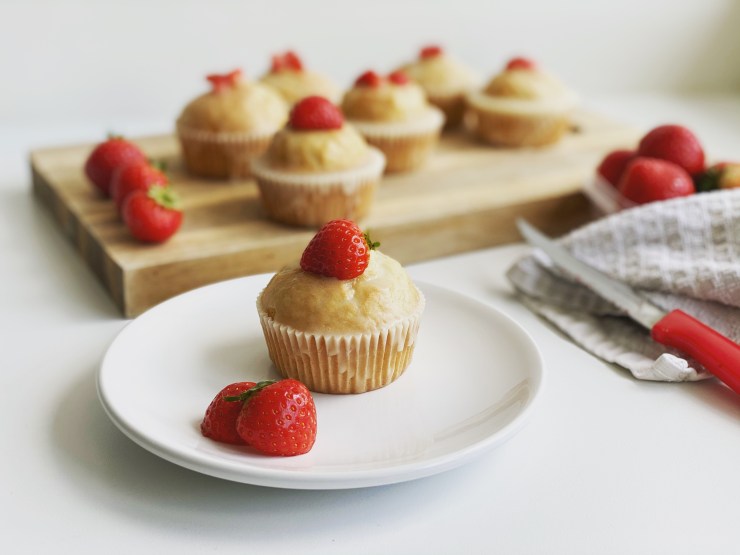 Mix the powdered sugar with the water for the glaze. Then, pour it on the muffins (completely cold) and decorate with half strawberry on top.