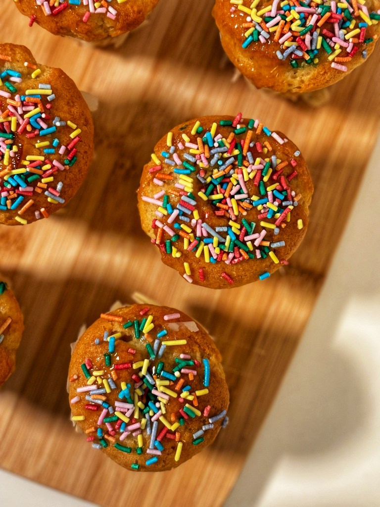 Brush the top of the cupcakes with the jam syrup and decorate with colored sprinkles.