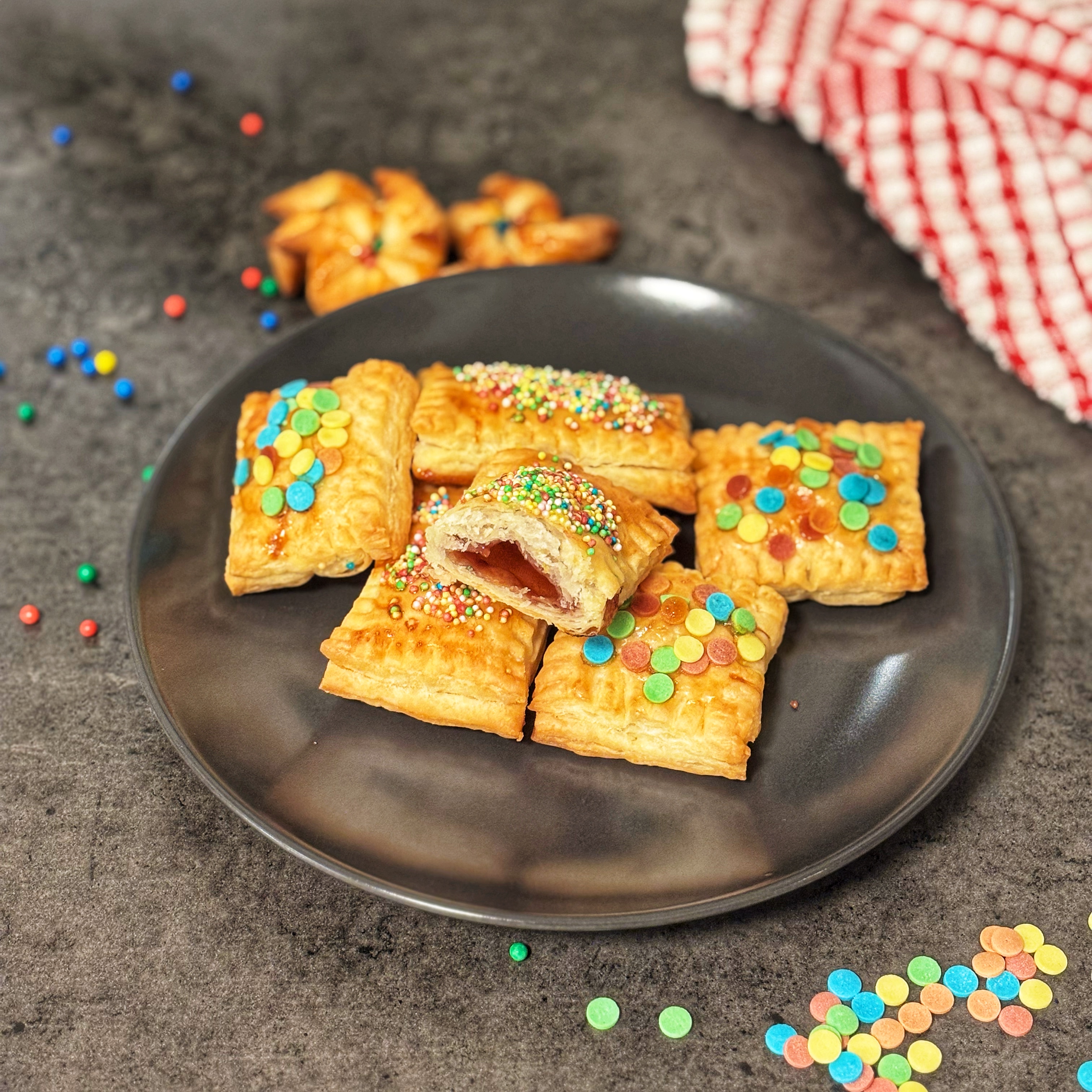 Unroll the puff pastry sheet and, using a knife, cut it into 5 cm squares. Place a teaspoon of jam on half of the squares, then cover them with the remaining pastry squares. Seal the ‘ravioli’ by pressing the edges with a fork to close them securely.