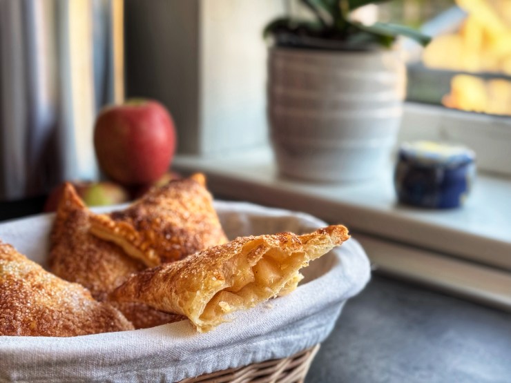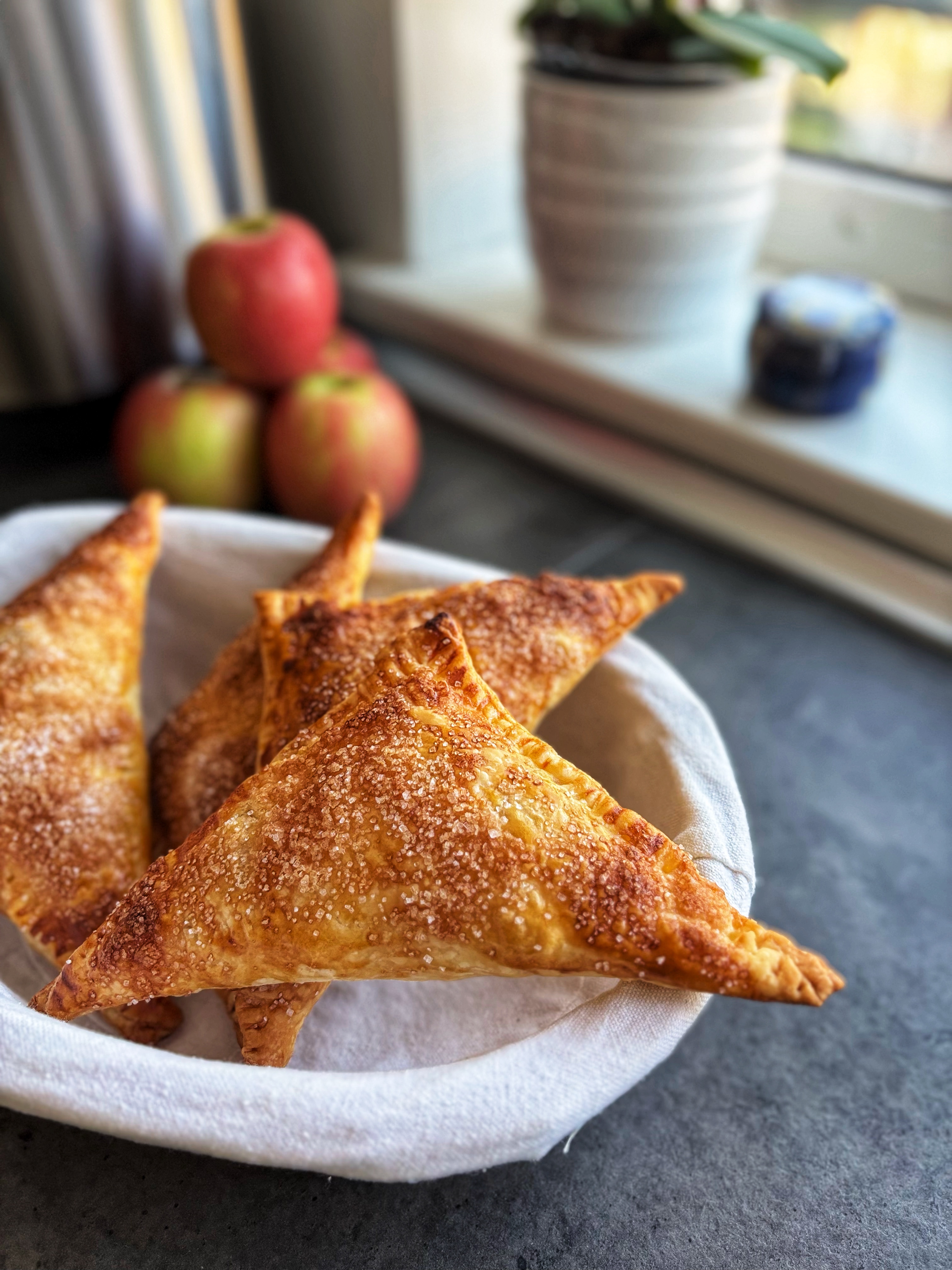Cut the puff pastry into 4 equal squares, about 14 cm each. Place 2–3 teaspoons of the apple mixture in the center of each pastry square. Fold each square into a triangle, sealing the edges by pressing them with a fork. Brush the tops with beaten egg and sprinkle generously with sugar.