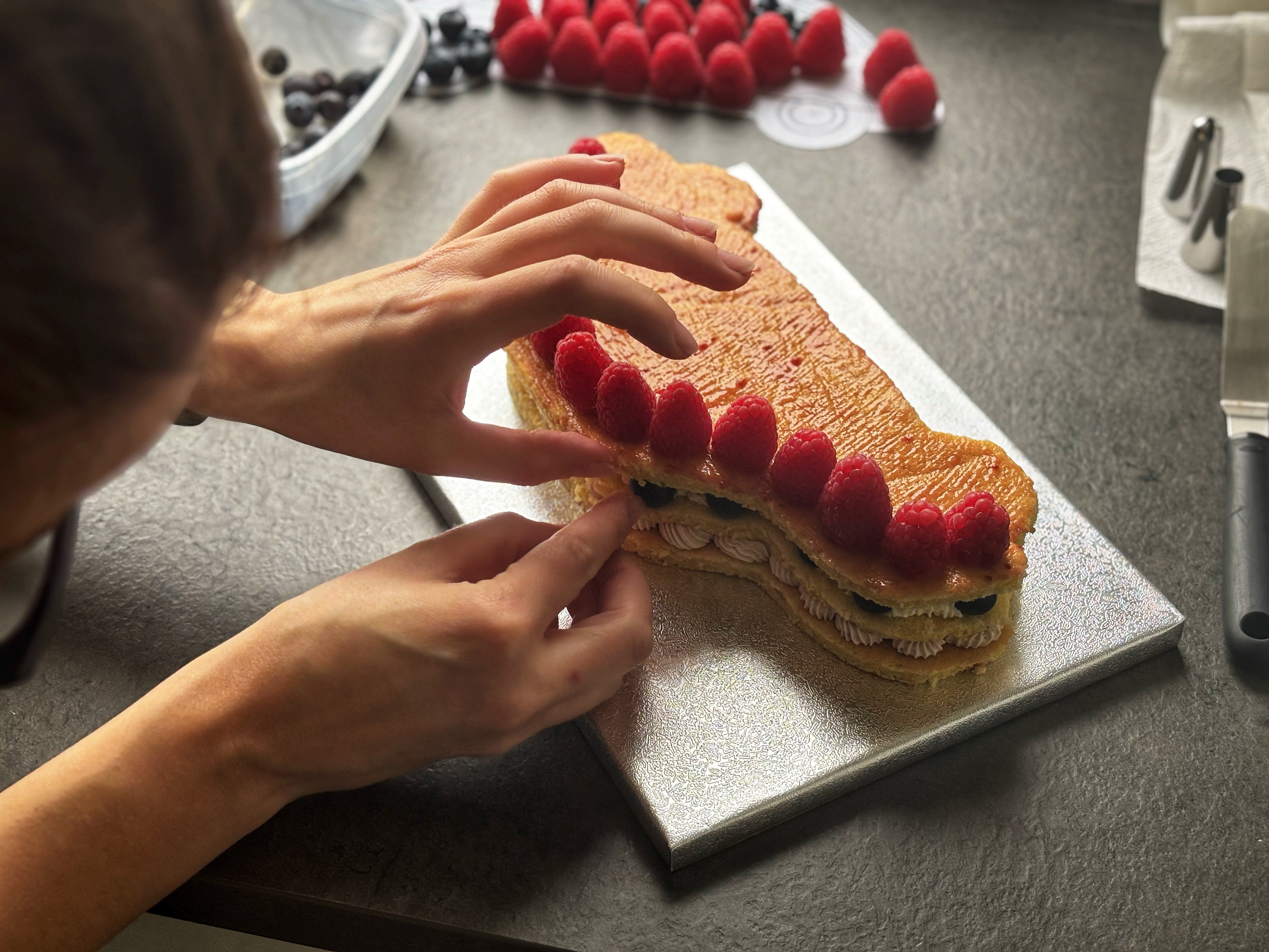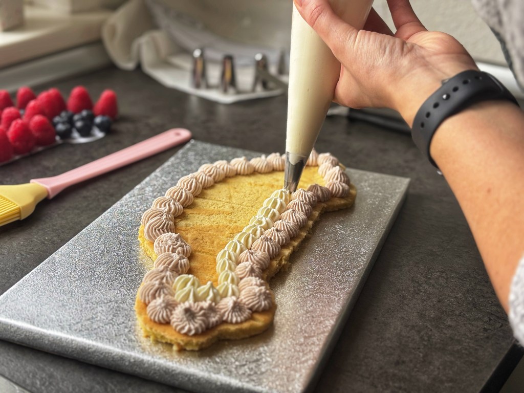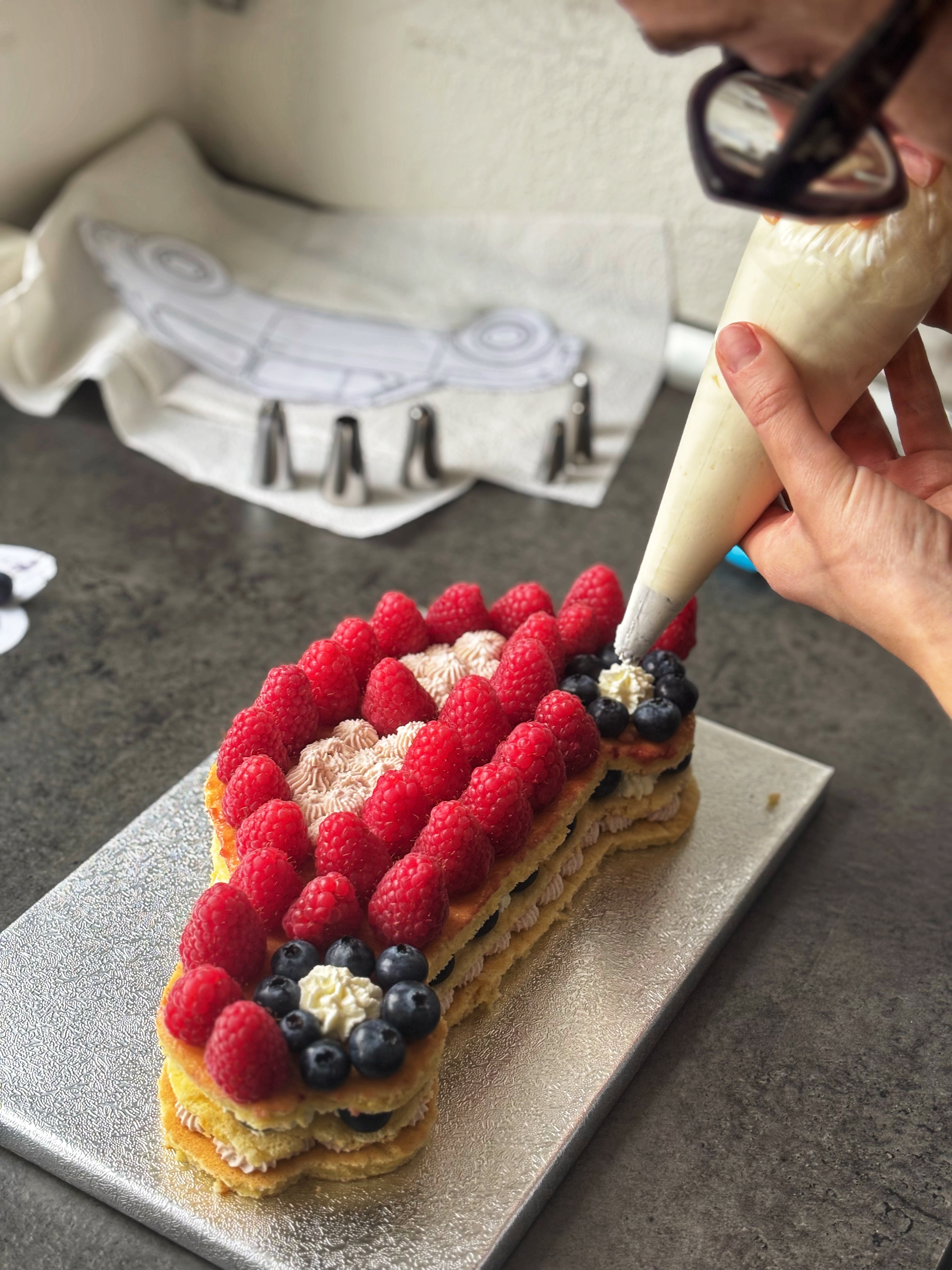 5. Place the final biscuit layer. Brush it lightly with leftover jam, then decorate with fresh berries and add some piping details to mimic wheels and windows for that Fiat 500 look.