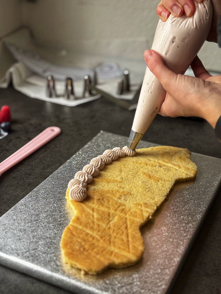 - Transfer both creams into separate piping bags (nozzle size: 0.5–1 cm).