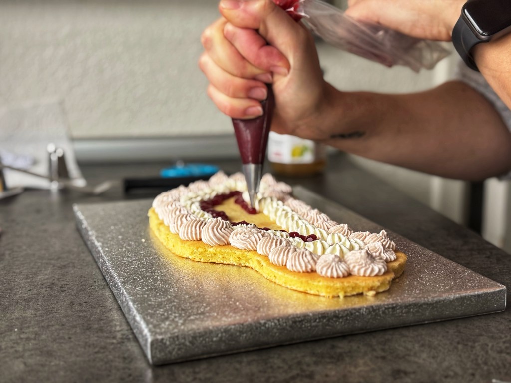 For my Nederlander’s birthday, a cake to honor his big passion for classic cars: a cream tart with fluffy, thin layers of biscuit sponge, a silky mascarpone cream, and raspberry jam. All shaped like a classic Fiat 500 🚗