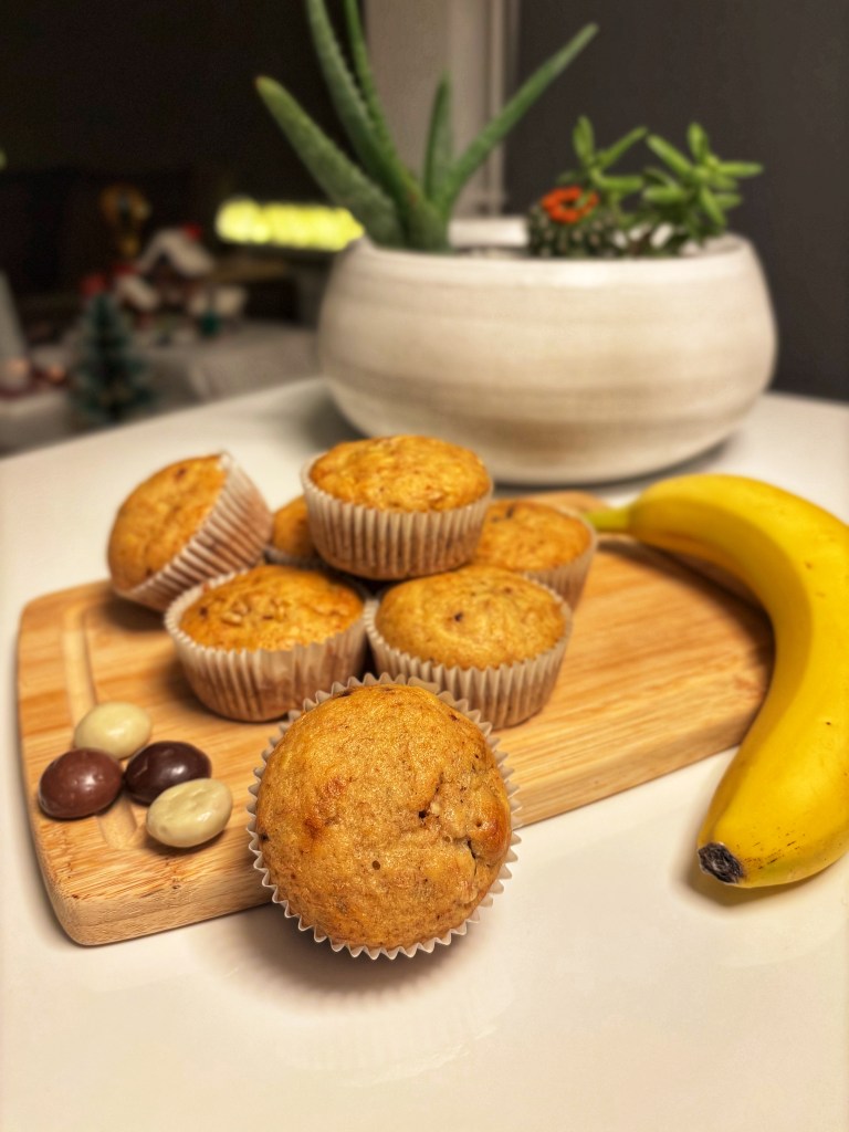 These banana muffins are filled with crunchy chocolate-covered kruidnoten, the Dutch spiced cookies that taste like little bites of December 🎄