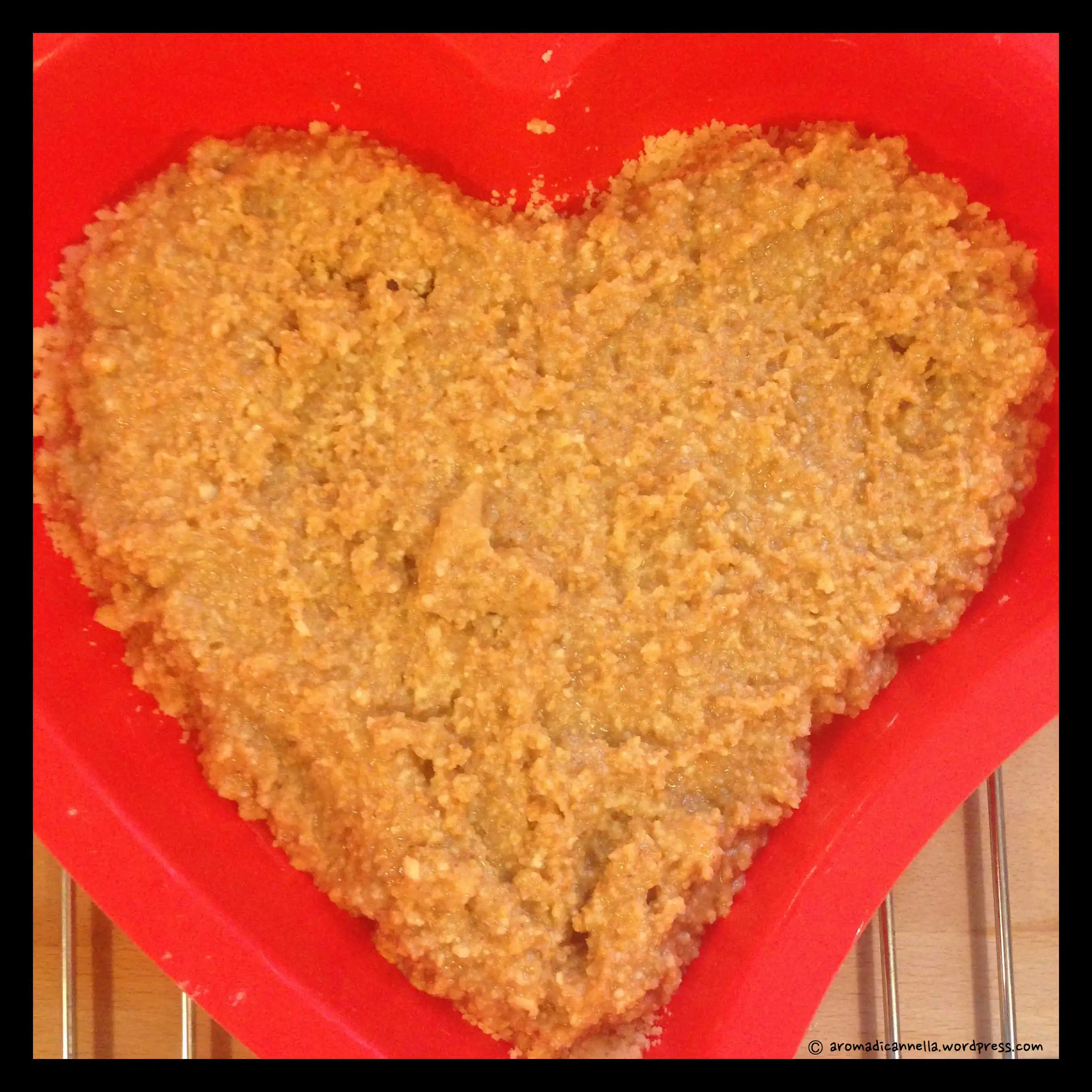 - Butter a cake tin (about 22–24 cm round, here I used a hearth spaced one). Add half of the crumbly cake mixture to the tin and spread it out evenly to form the base.